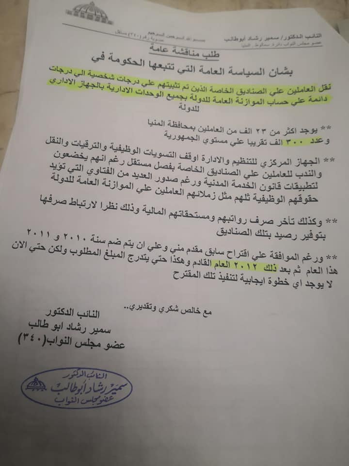 شهد مجلس النواب اليوم نشاطا ملحوظا وكان للدكتور سمير رشاد أبوطالب عضو مجلس النواب عن دائرة سمالوط بالمنيا الأفضلية والاسبقية في تقدمة بطلب مناقشة عامة بشأن العاملين علي الصناديق الخاصة بفصل مستقل وتجميد اوضاعهم الوظيفية من قبل الجهاز المركزي للتنظيم والإدارة والجدير بالذكر ان هناك اكثر من ٣٠٠ ألف موظف حكومي يعملون بالجهاذ الإداري للدولة تم تثبيتهن على الصناديق الخاصة بفصل مستقل عام ٢٠١٢ بقرار مجلس الوزراء وبموافقة الجهاز المركزي للتنظيم والإدارة ووزارة المالية ومنذ ذلك التاريخ يعانون من تردي اوضاعهم المالية والاجتماعية والاقتصادية بسبب عدم انتظام صرف رواتبهم ومستحقاتهم المالية وذلك نظرا لارتباط صرفها بتوافر رصيد بتلك الصناديق من عدمة بالإضافة الى تعنت وتجاهل رءيس الجهاذ المركزي للتنظيم والإدارة الذي اوقف الترقيات والتسويات والنقل والندب للعاملين على الصناديق الخاصة بفصل مستقل رغم أنهم يخضعون لتطبيقات قانون الخدمة المدنية ويعملون بوحدات الجهاز الإداري للدولة وللأسف الشديد أدي تجميد اوضاعهم الوظيفية إلي الاطاحة بامالهم وطموحاتهم وادي تضارب ردود الجهاز المركزي للتنظيم والإدارة في الرد على نواب البرلمان والجهات الحكومية إلي تقديم طلب مناقشة عامة مقدم من الدكتور سمير رشاد أبوطالب عضو مجلس النواب وعشرون نائبا بينهم المستشار همام العادلي رءيس لجنة الاقتراحات والشكاوي بمجلس النواب