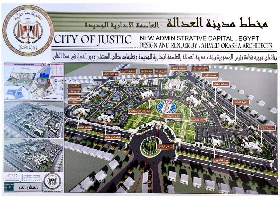 حيث وجه السيد الرئيس بأن يكون موقع مدينة العدالة في محيط كل من الحي الحكومي والبرلمان ومجلس الشيوخ، لتتكامل رموز السلطات الرئيسية في الدولة، التنفيذية والتشريعية والقضائية، في نطاق جغرافي واحد ترسيخاً لأركان الجمهورية الجديدة بكافة مكوناتها.