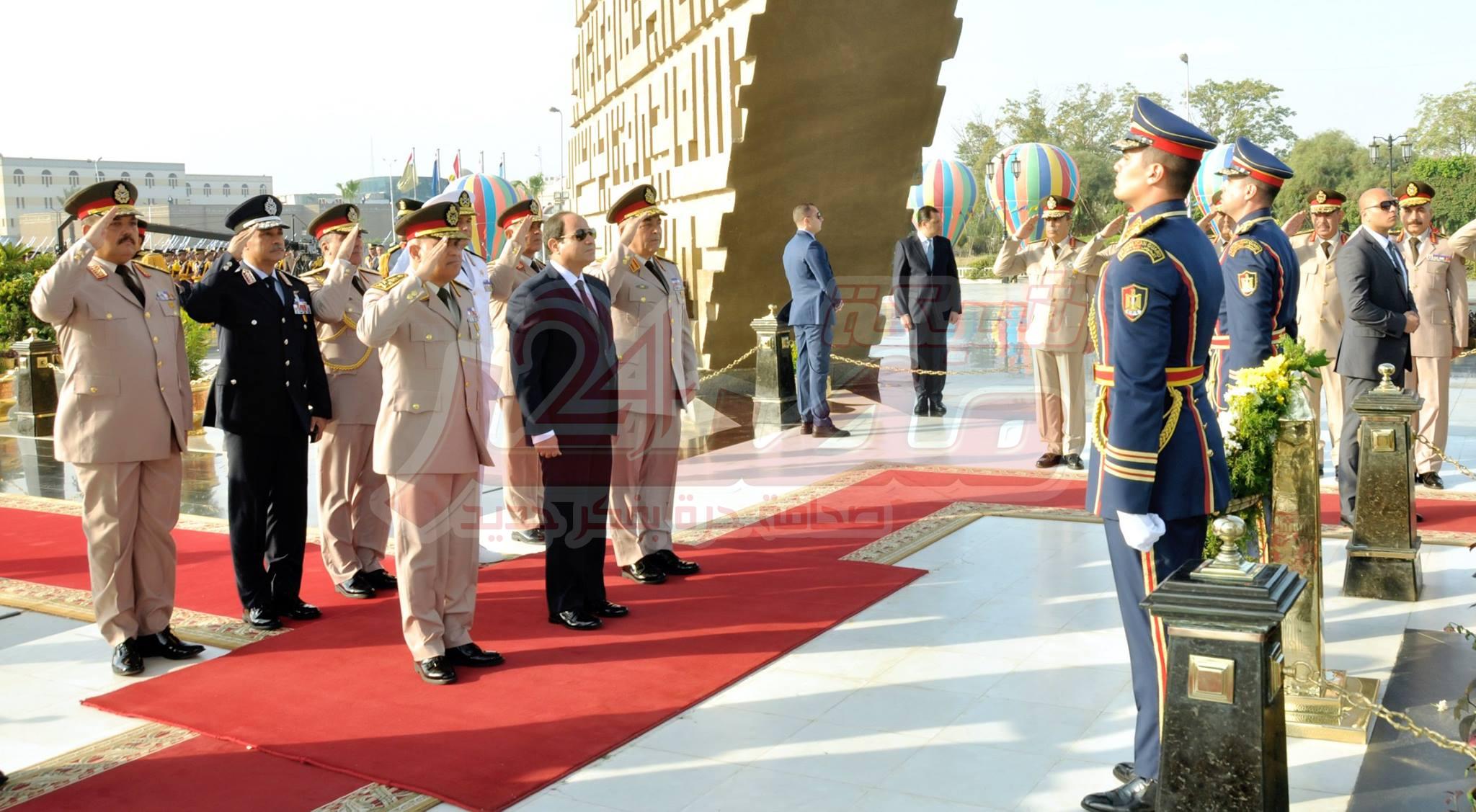 وقام الرئيس السيسى بوضع إكليل الزهور على قبر الجندى المجهول وقراءة الفاتحة ترحماً على أرواح شهداء مصر وعزفت الموسيقات العسكرية سلام الشهيد .