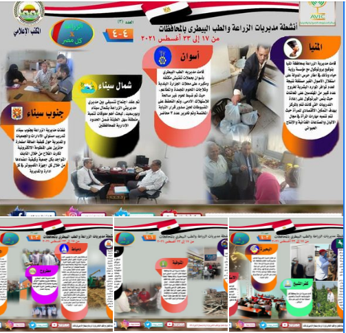 أصدر مركز المعلومات الصوتية والمرئية التابع لوزارة الزراعة واستصلاح الأراضي، والمكتب الإعلامي للوزارة، العدد الثالث من إصدار: "الزراعة في كل مصر" بالانفوجراف والفيديو، يوضح الجهود والأنشطة التي تقوم بها مديريات الزراعة والطب البيطري بمحافظات الجمهورية خلال الفترة من ١٧ إلى ٢٣ أغسطس الجاري.