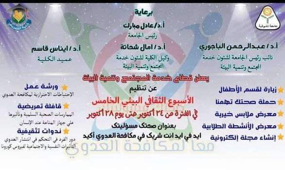 ينظم قطاع خدمه المجتمع وتنميه البيئه بكليه التمريض جامعة المنوفية الأسبوع الثقافى البيئى الخامس للكليه فى الفتره من ٢٤ إلى ٢٨ اكتوبر تحت رعايه الدكتور عادل مبارك رئيس الجامعه و الدكتور عبد الرحمن الباجورى نائب رئيس الجامعه لشئون خدمه المجتمع وتنميه البيئه والدكتور ايناس قاسم عميد الكليه الدكتوره امال شحاته وكيل الكليه لشئون خدمه المجتمع