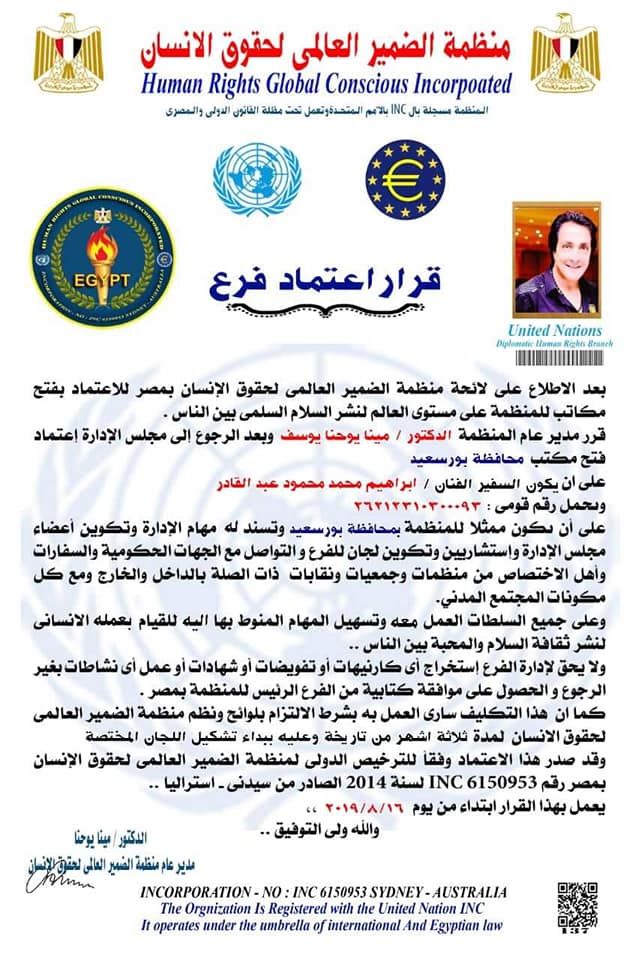 تحت رعاية الدكتور. مينا يوحنا يوسف مدير عام منظمة الضمير العالمي لحقوق الإنسان تم اليوم الجمعه الموافق ٢٠١٩/٨/١٦ افتتاح فرع جديد للمنظمة بمحافظة بورسعيد واعتماد السفير .ابراهيم محمد محمود عبد القادر مديرآ للفرع وتسند له مهام الإدارة وتكوين أعضاء مجلس الإدارة واستشاريين وتكوين لجان للفرع والتواصل مع الجهات الحكومية والسفارات وأهل الاختصاص من منظمات وجمعيات ونقابات ذات الصلة بالداخل والخارج ومع كل مكونات المجتمع المدني وعلي جميع السلطات العمل معه وتسهيل المهام المنوط بها إليه للقيام بعمله الانساني لنشر ثقافة السلام والمحبة بين الناس