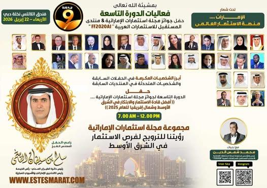أعرب الخبير الاقتصادي والإعلامي العربي محمد شمس الدين رئيس ومؤسس مجموعة مجلة استثمارات الإماراتية و منتدى المستقبل للاستثمارات العربية FF2020AI، عن فخره بأن يكون الراعي الشرفي للعام التاسع والقائم بتوزيع الجوائز على المكرمين الشيخ سالم بن سلطان القاسمي راعي الحفل، تأكيداً على ثقافة التكريم التي تميزت بها دولة الإمارات وعلى مسارات والدور المحوري الإعلام الإماراتي الوطني.