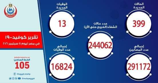 وأوضح الدكتور خالد مجاهد مساعد وزيرة الصحة والسكان للإعلام والتوعية، والمتحدث الرسمي للوزارة، أنه تم تسجيل 399 حالة جديدة ثبتت إيجابية تحاليلها معمليًا للفيروس، وذلك ضمن إجراءات الترصد والتقصي والفحوصات اللازمة التي تُجريها الوزارة وفقًا لإرشادات منظمة الصحة العالمية، لافتًا إلى وفاة 13 حالة جديدة.