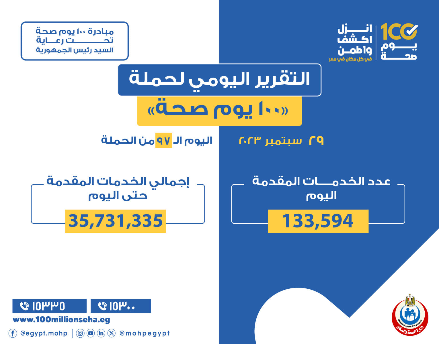 أعلن الدكتور خالد عبدالغفار وزير الصحة والسكان، تقديم 133 ألفا و594 خدمة، من خلال حملة «100 يوم صحة» أمس الجمعة 29 سبتمبر، في جميع محافظات الجمهورية.