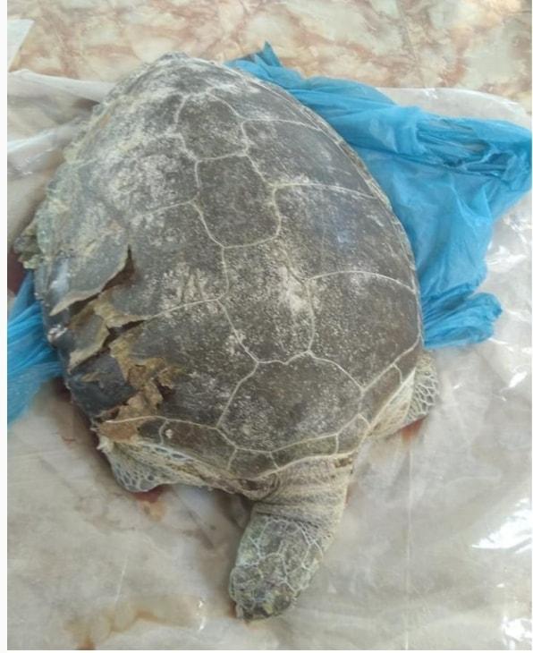 تلقى الاستاذ الدكتور / محمود عبد الراضي دارمدير فرع البحر الاحمر بلاغا من المحميات الطبيعية فرع البحر الاحمر بوجود سلحفاة نافقة وتم تسليمها للمعهد مساء السبت الموافق 7/3/2020 وعلى الفور تم تشكيل فريق بحثى من فرع المعهد للكشف على السلحفاة لتحديد سبب الوفاة وتبين انها نافقة منذ عدة ايام وفى حالة عفونة شديدة ويبلغ طولها حوالى 80سم وعرضها حوالى 50 سم.. وبناءا على ذلك تقرر دفنها بسبب تهتك الجلد وعدم صلاحيتها للتحنيط