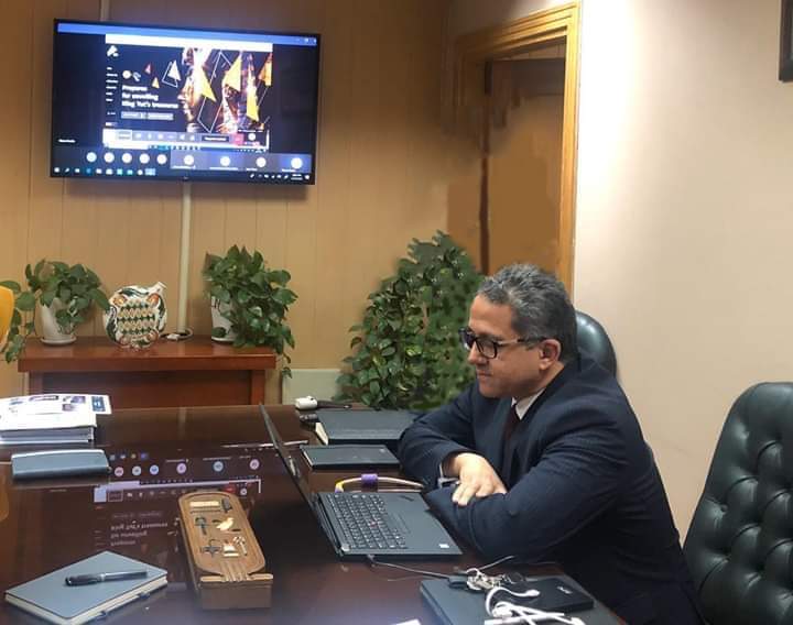 عقد الدكتور خالد العناني وزير السياحة والآثار اجتماعا عبر الفيديو كونفيرانس من مقر الوزارة بالزمالك مع فريق عمل شركة *مايكروسوفت* المسؤل عن إنشاء وتصميم الموقع الإلكتروني الخاص بالمتحف المصري الكبير، وذلك بحضور الدكتور الطيب عباس مدير المتحف للشئون الأثرية، وفريق قسم تكنولوجيا المعلومات بالمتحف.