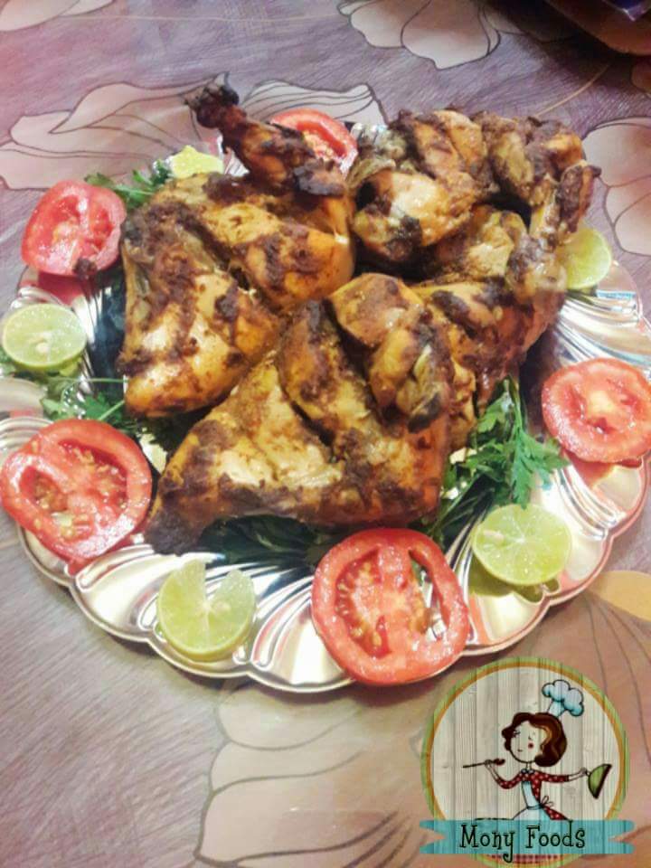يغسل الدجاج، ويقطع ارباع، يزال الجلد وتصنع تشققات وفتحات في كل قطعة، ويوزع الخل فوق الدجاج، ويدعك جيدا، نضع الثوم والزعفران والبابريكا والزنجبيل والكزبره والكمون والحبهان والصلصة و الزبادي وزيت الزيتون والملح والفلفل والليمون في وعاء زجاجي، ونخلطهم جيدا ويوزع الخليط علي قطع الدجاج، يغطى بالنايلون ويوضع في الثلاجة، عدة ساعات ويسخن الفرن لدرجة حرارة 200، وتدخل قطع الدجاج الي الفرن لمدة نصف ساعة، يوضع السمن في قطعة مكورة من الفويل، ونضعها في صينيه الدجاج، ونسخن فحم حتي الاحمرار وتوضع علي السمن، وتضغطي الصينية بقطعة فويل كبيرة ونتركها في الفرن لمدة ساعة، حتي يستوي الدجاج وبالهنا والشفا.