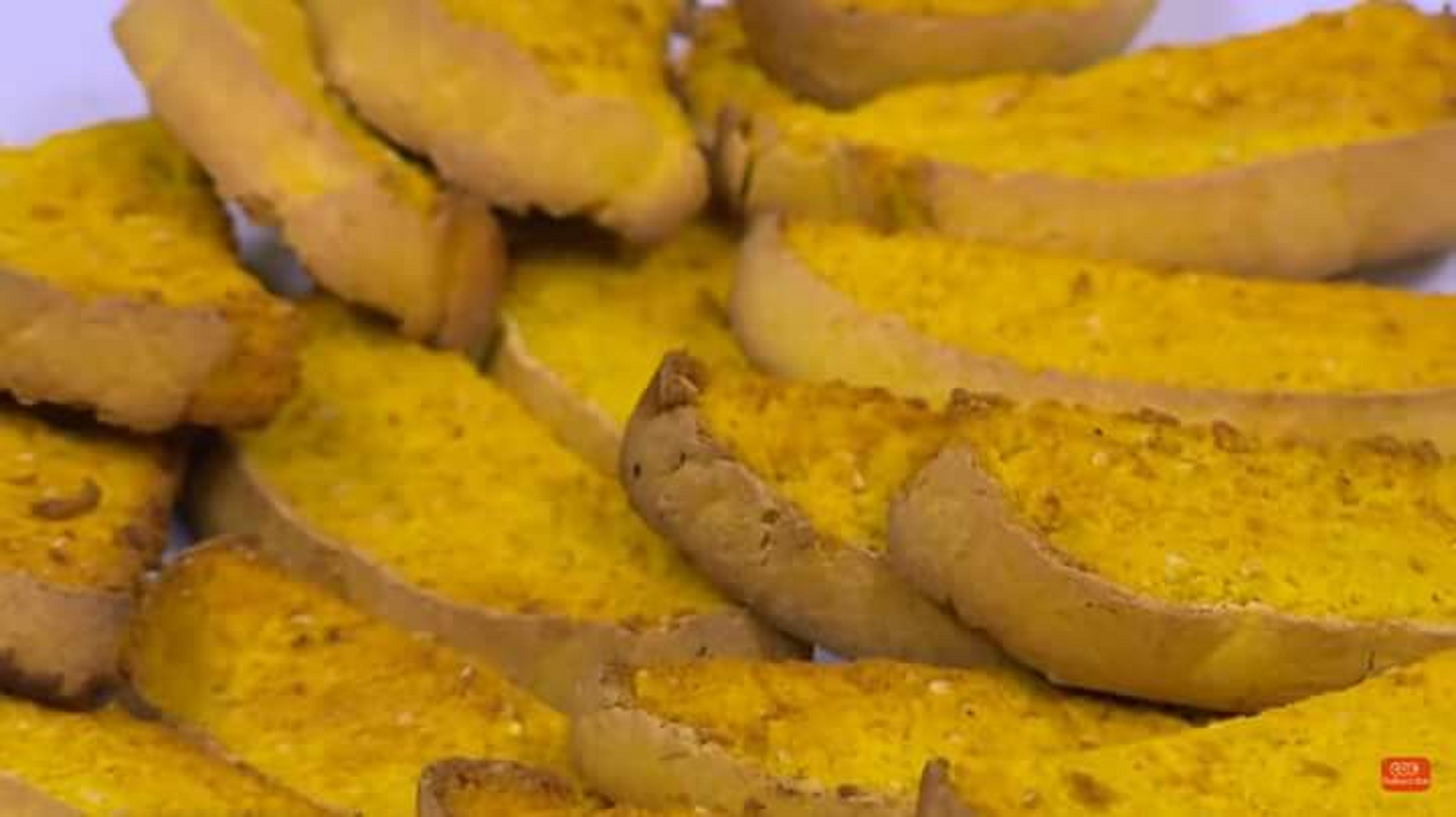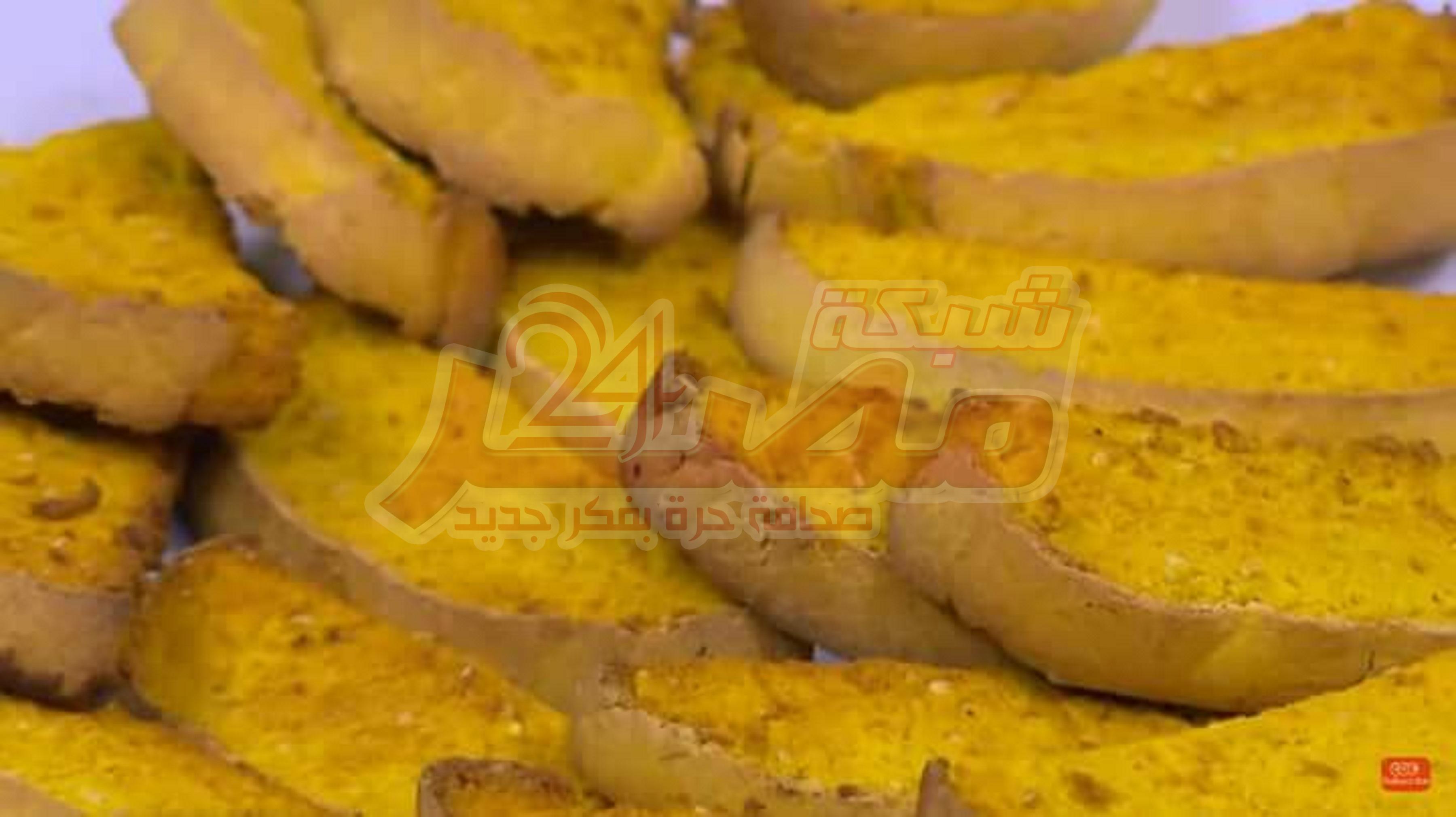 وبعد أن تبرد تقطع الي شرائح ويدخل الفرن مره ثانيه ويحمص علي نار هادئه جدا حتي لا يحترق
