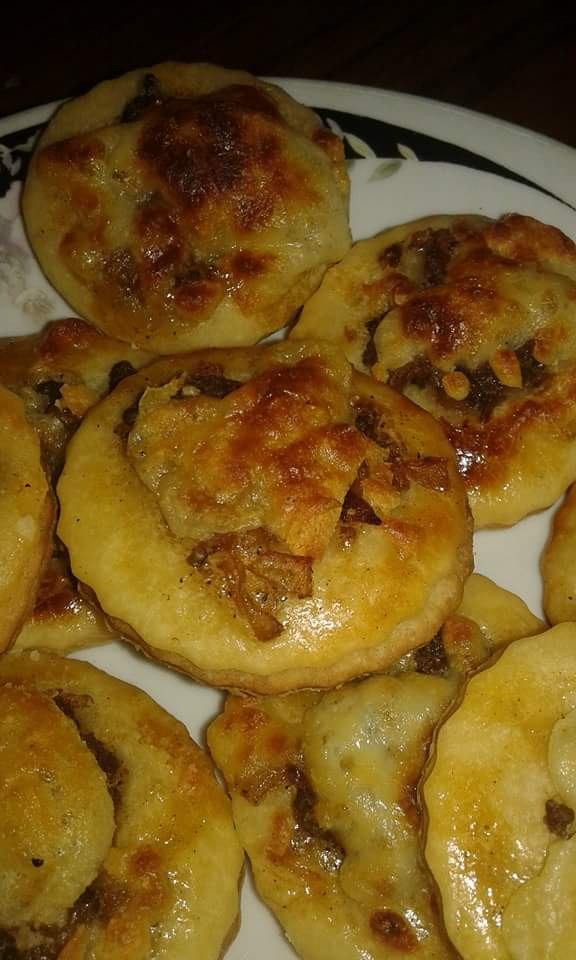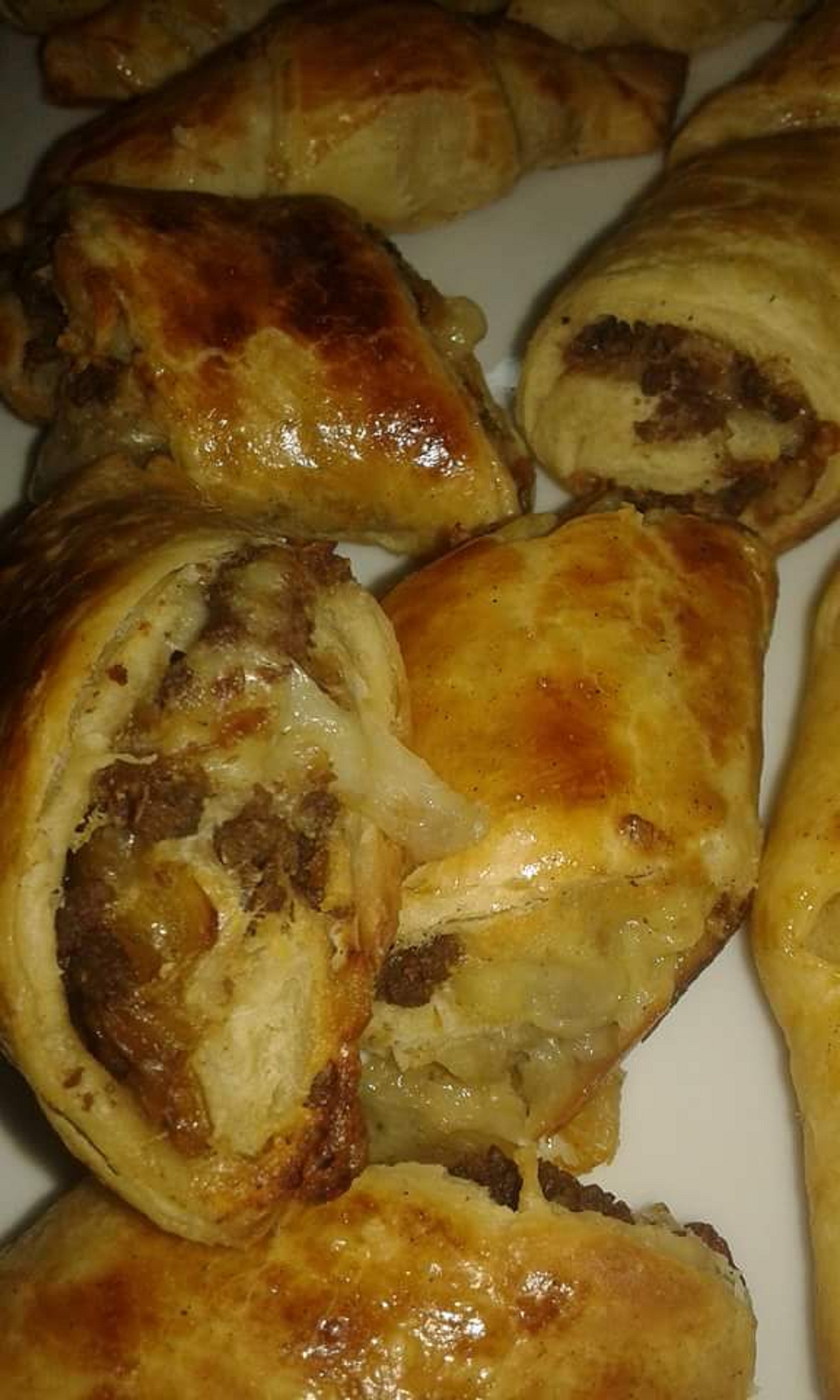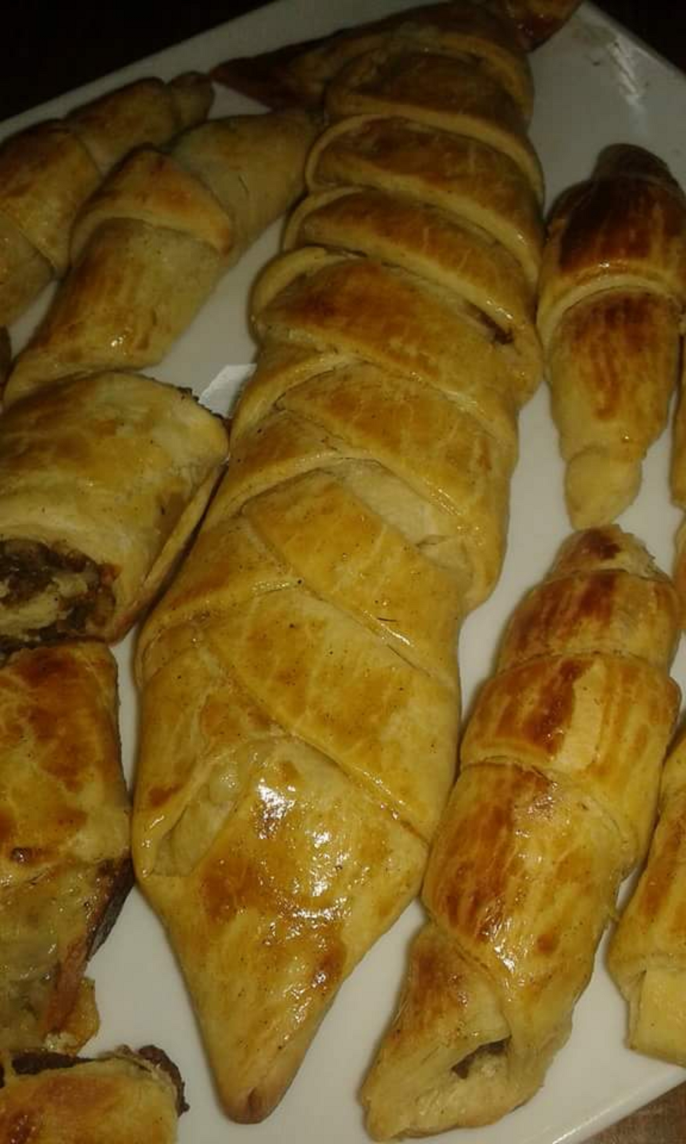 ويتم عجنه بباقىاللبن وتترك العجينة 30 دقيقة لترتاح، ثم تقطع إلى كور متساوية وتفرد كما موضح بالصور ويتم دهن كل واحدة بالذبدة وتفرد التانية وهكذا حتى 8 كور وتترك لترتاح قليلا وتفرد ثم تقطع مثلثات وتحشى بأى حشوة تريدينها انا حشيتها لحمة مفرومة معصجة وجبنة موتزاريلا وترص فى الصوانى وتترك مرة ثانية لتختمر وقبل دخولها الفرن يدهن الوجه بالبيض المخلوط باللبن والنسكافيه ويخبز فى فرن ساخن جداً حتى يأخذ اللون الذهبي والف هنا وشفا