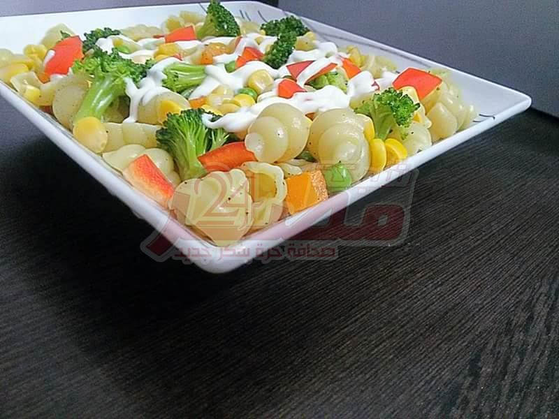 نقوم بسلق المكرونة، ثم تسوية الخضار البسلة والجزر والبروكلي علي حمام بخار لينضج، ثم نضعه بماء بارد مثلج لتقف عملية الطهو والحفاظ علي الوان الخضار، نضع المكرونة بعد تبريدها في وعاء ونضع الخضار بأكمله في الوعاء ونضع الملح والفلفل الأسود وتزين بالمايونيز وهي وصفة متكاملة من بروتين ونشاويات في المكرونة وفيتامينات بالخضار الموجود بها والألوان المفرحة تساعد علي فتح شهية الطفل بالمدرسة.