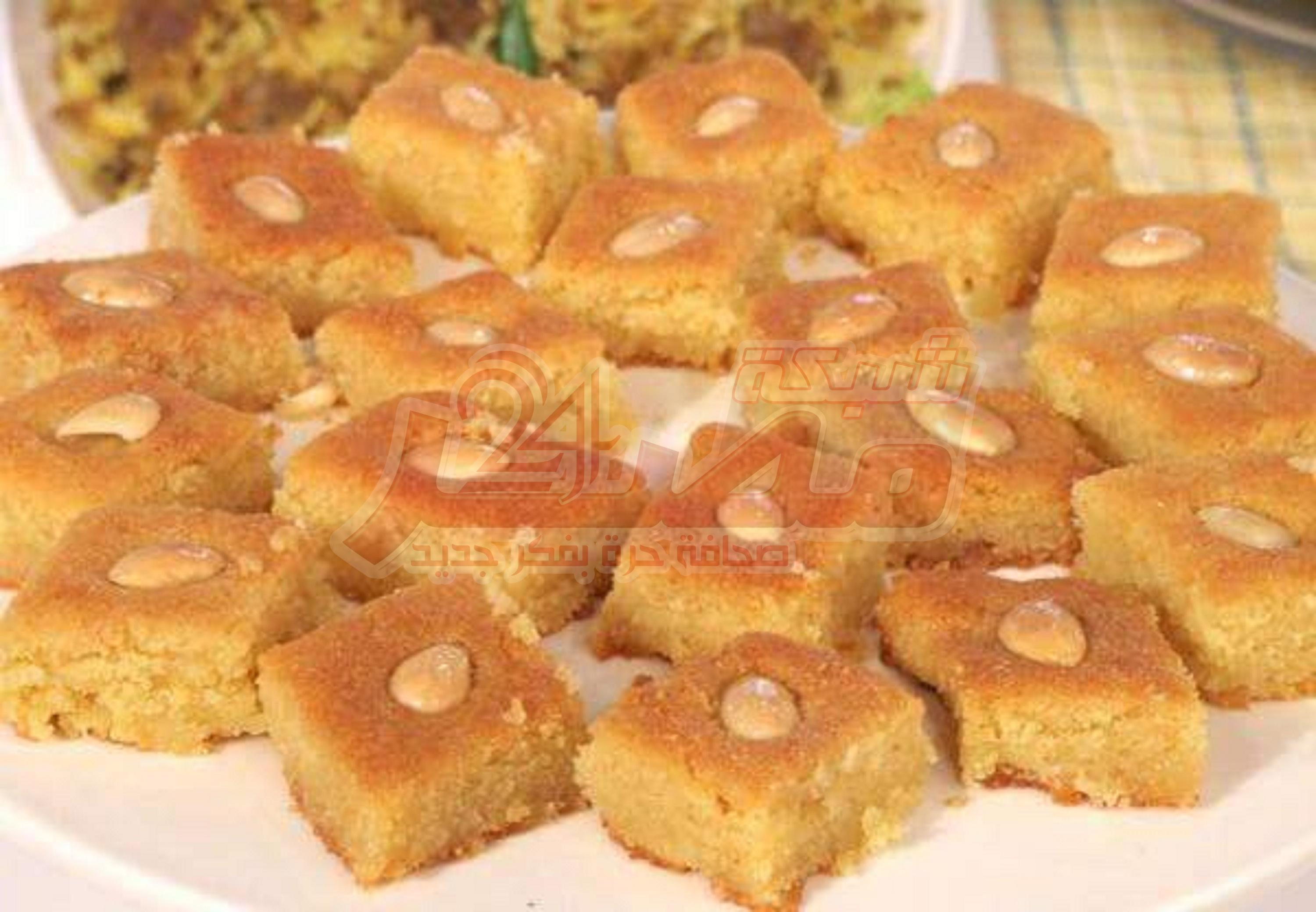 - قومي بتسخين الفرن علي درجة حرارة 180 درجة مئوية، وفي صينية خبز مدهونة بالزبد المذوب يوضع خليط السميد. بعد ذلك قومي بتقطيع الصينية علي هيئة مربعات وضعي اللوز المشرح فوق كل قطعة. ملحوظة لا تدخل الصنية مباشرة الى الفرن يجيب ان ترتاح منعا لكى لا يتشقق الوجة