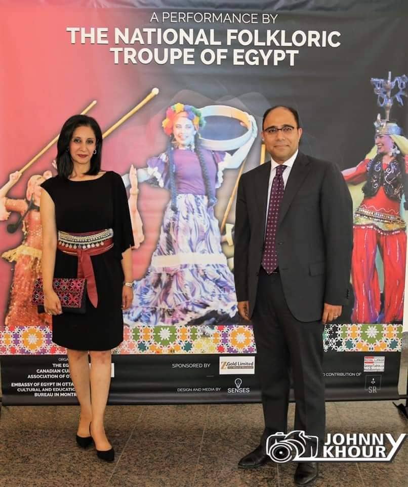 وكان في استقبالهم السفير أحمد ابو زيد وحرمه سفير مصر بكندا ، وصرح السفير عن تقديره البالغ للتعاون الكبير الذي قدمته وزارة الثقافة تحت إشراف مباشر من الاستاذة الدكتورة إيناس عبد الدائم وزيرة الثقافة لتسهيل إيفاد الفرقة القومية الي كندا، والتنسيق رفيع المستوي بين أعضاء فريق العمل الذى تم تشكيله من المكتب الثقافى المصرى بمونتريال والجمعية المصرية الكندية الثقافية والسفارة في أوتاوا كي تخرج تلك الاحتفالية بهذا المستوى الرائع من النجاح ، كما القي السفير أحمد ابو زيد كلمة في بداية الحفل قدم خلالها استعراضا لتاريخ الفرقة وما تقدمه من فنون ورقصات تعبر عن مختلف ربوع ومحافظات مصر