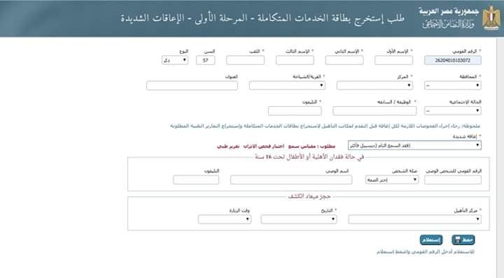 وقالت وزيرة التضامن الاجتماعي أن الراغب في الحصول على بطاقات الخدمات المتكاملة الدخول على موقع الوزارة وملأ النموذج الموجود على الموقع والذي يحتوي على أسئلة أساسية عن الاسم والرقم القومي ونوع الإعاقة والعنوان والسن والحالة الاجتماعية ورقم التليفون .
