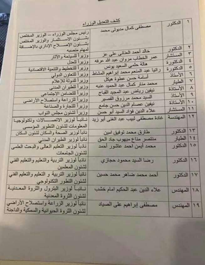 أخيرا وبعد طول انتظار وترقب للأسماء الجديدة كوزراء تم التصويت على التعديل الوزاري اليوم من قبل مجلس النواب وتم الإبقاء على المهندس مصطفى مدبولي كرئيس لمجلس الوزراء ودمج السياحة مع الآثار برئاسة الدكتور خالد العناني وتولى المستشار عمر مروان وزيرا للعدل والدكتورة هالة السعيد وزيرا للتخطيط والتنمية الإقتصادية والدكتورة رانيا المشاط للتعاون الدولي والأستاذ أسامة هيكل وزيرا للإعلام والطيار محمد منار عنبة وزيرا للطيران والأستاذة نيفين القباج وزيرا للتضامن الإجتماعي والأستاذة نيفين جامع وزيرا للتجارة والصناعة والمستشار علاء الدين فؤاد وزيرا لشئون المجالس النيابية