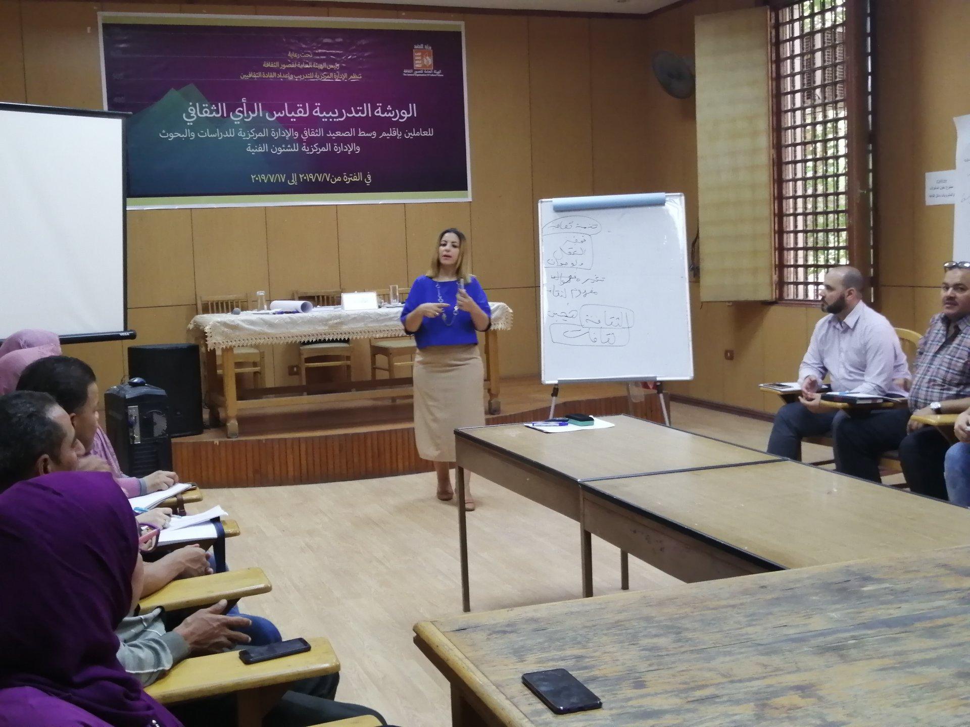 ارتبطت الثقافة بالوجود الإنساني ارتباطاً متلازماً مع تطور الحياة الإنسانية وفقاً لما يقدمه الفرد من إبداع وإنتاج في شتى المجالات فهي المحرك الأساس للفعل الإنساني، ومعيار الحضارة لدى الأمم ورقيّها وتقدمها الثقافي بكل دلالات اللفظ ومحتوياته، وهذا ما تشهد به المدنية المعاصرة ويساعد بطبيعة الحال على تنوع وثراء القضايا التي يتم طرحها و تقاسم الثروات التي تجسدها كل ثقافة حسب القضية المطروحة أو المسائل التي تثيرها بعض جوانب الثقافة أو عناصرها، إما فيما يتعلق منها بالوجود أو بالقيم أو بالنظم، ونتناولها في صيغة قضايا تواجهنا في واقعنا المعاصر الذي نعيشه، ونحتاج تجاهها موقف نحدد به وجهتنا.وقد يكون لتلك القضايا تأثيراً بالسلب أو بالإيجاب حسب المنابر الداعية لها . وأي ما تكن القضية فثما آثار ايجابية يدور حولها الحدث وهذا الاثر يتعدى الفرد ليصل الي المجتمع لخلق روح الابداع وصناعة التنافس وكشف القدرات والمواهب الكامنة، وهو ما دعت اليه دكتورة هبه مغيب في ثالث أيام ورشة ” قياس الرأي الثقافي“ الذي تقدمه الادارة المركزية للتدريب إعداد القادة الثقافيين لأثنين وعشرين متدرباً من اقليم وسط الصعيد الثقافي والدراسات والبحوث والشئون الفنية موكدةً على أن تنوع القضايا الثقافية وبراعة تناولها هو بمثابة ميدان لصقل كافة القضايا على مختلف أنواعها وتعدد منابرها .