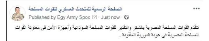 قدمت القوات المسلحة المصرية الشكر والتقدير للقوات المسلحة السودانية وأجهزة الأمن في معاونة القوات المسلحة المصرية في عودة الدورية المفقودة، بحسب بيان للمتحدث العسكري العقيد تامر الرفاعي، عبر صفحته الرسمية على "فيس بوك".
