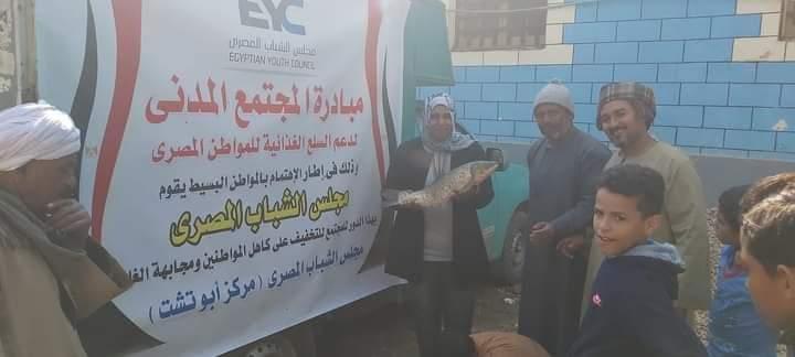 نظم مجلس الشباب المصري بمركز أبوتشت بمحافظة قنا، اليوم الخميس، مبادرة مجتمعية لدعم السلع الغذائية للمواطنين، وذلك بتوفير سيارة لبيع الأسماك بأسعار مخفضة للمواطنين، وذلك بحضور الزهراء عبد الفتاح منسق مركز أبوتشت، ومصطفى كمال المدير التنفيذي، وزينب ابراهيم رئيس الوحدة المحلية لقرية بخانس، وأعضاء المكتب التنفيذي لمجلس الشباب المصري بمركز أبوتشت.