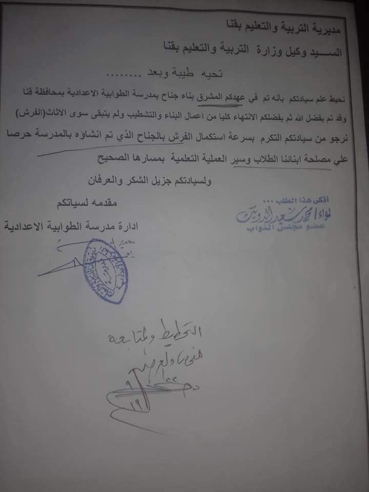 تم اليوم الاربعاء الموافق ٢٠١٩/١٠/٩ إستلام المقاعد والاثاث الخاص بمدرسة الطوابية الجديدة بقنا اعدادى ثانوى تمهيدا لأفتتاحها ودخول الطلاب وانتظام الدراسة بها