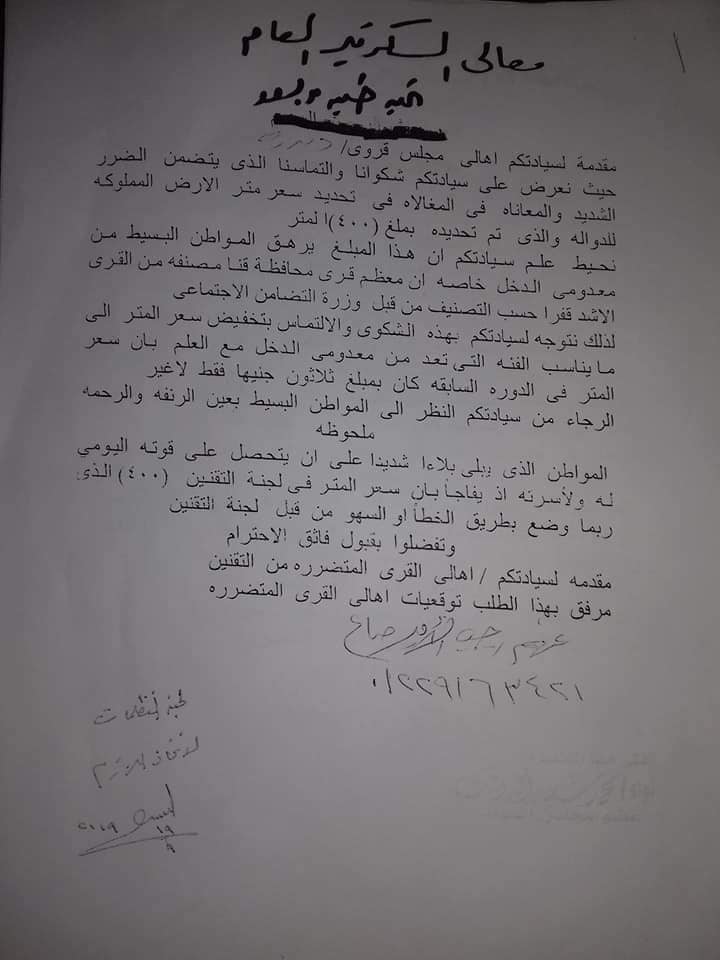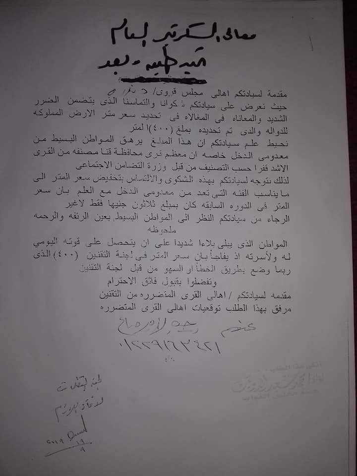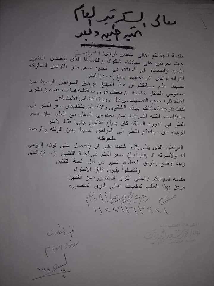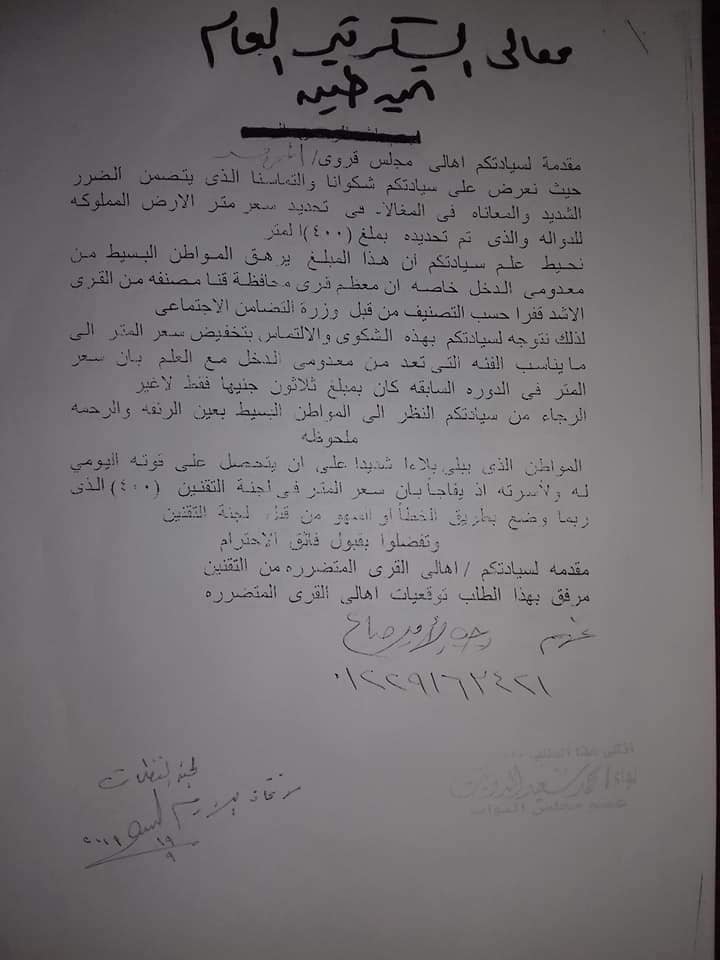 تم تخفيض سعر المتر لأراضى املاك الدولة ( التقنين ) الى ٣٠٠ بدلا من ٤٠٠ جنية وجارى التنسيق مع اجهزة محافظة قنا لخفض سعر المتر الى اقل من ذلك
