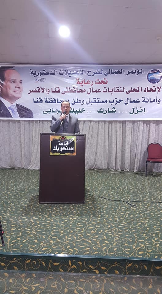 المؤتمر العمالى لنقابات عمال محافظتى قنا والأقصر وأمانة عمال حزب مستقبل وطن بمحافظة قنا بحضور القيادات التنفيذية والشعبية بالمحافظة وعلى رأسهم الدكتور عباس منصور رئيس جامعة جنوب الوادي والأمين العام لحزب مستقبل وطن