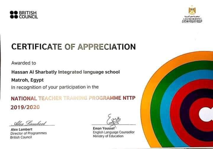 منح المركز الثقافي البريطاني شهادة تقدير لمدرسة حسن الشربتلى الابتدائية الرسمية المتميزة للغات، برئاسة الاستاذة اكرام شوقي مديرة المدرسة، وذلك تقديرا للمساهمة المتميزة والفعالة لمدرسي اللغة الإنجليزية ومدربة برنامج NTTP الأستاذة / رسل عاطف
