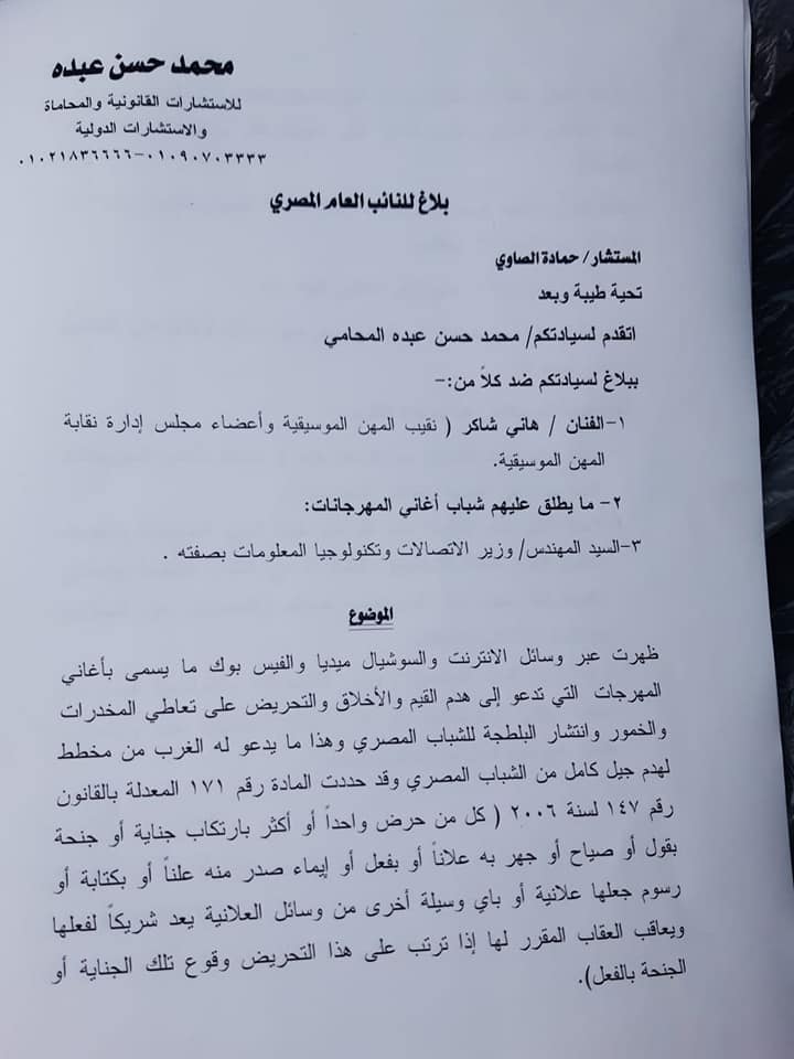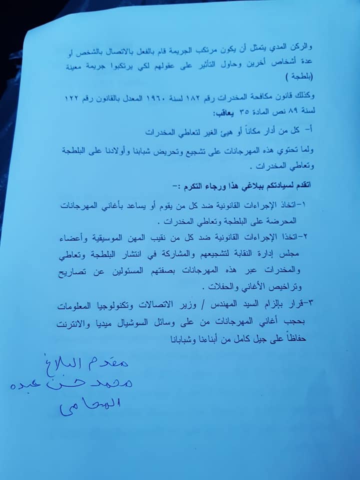 اتخذا الإجراءات القانونية ضد كل من نقيب المهن الموسيقية وأعضاء مجلس إدارة النقابة لتشجيعهم والمشاركة في انتشار البلطجة وتعاطي والمخدرات عبر هذه المهرجانات بصفتهم المسئولين عن تصاريح وتراخيص الأغاني والحفلات .