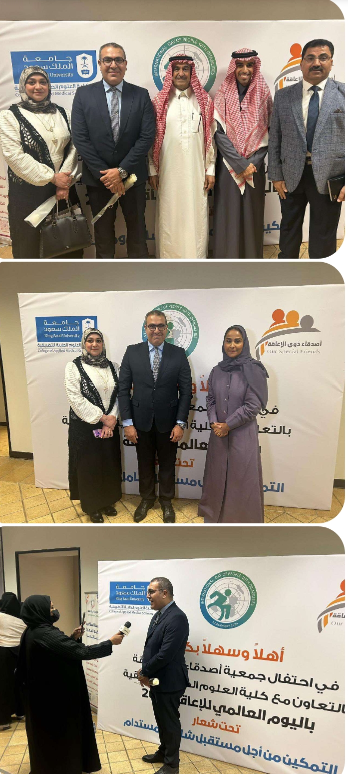 شارك الأستاذ الدكتور أحمد سعيد فهيم منصور الملحق الثقافي التعليمي المصري بالسعودية في فعاليات ملتقى دعم ورعاية ذوي الهمم تزامنًا مع اليوم العالمي للأشخاص ذوي الهمم ٣ ديسمبر من كل عام، بمشاركة لفيف من القيادات من جامعة الملك سعود بالمملكة العربية السعودية، وجمعية أصدقاء ذوي الهمم، وذلك بمقر كلية العلوم الطبية التطبيقية بجامعة الملك سعود.