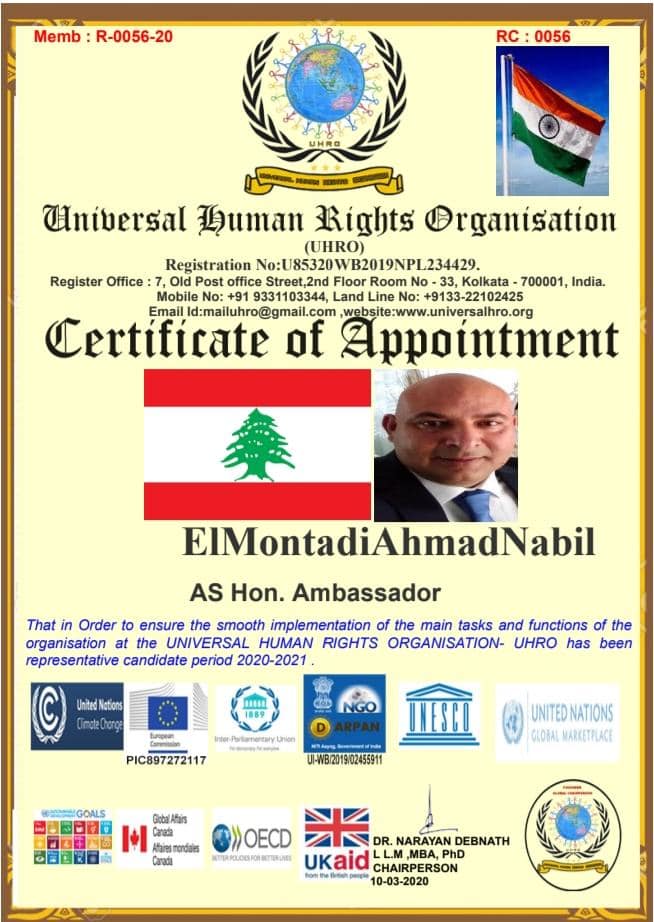 تعيين الاستاذ /احمد نبيل المهتدي سفيرا للنوايا الحسنة عن دوله لبنان