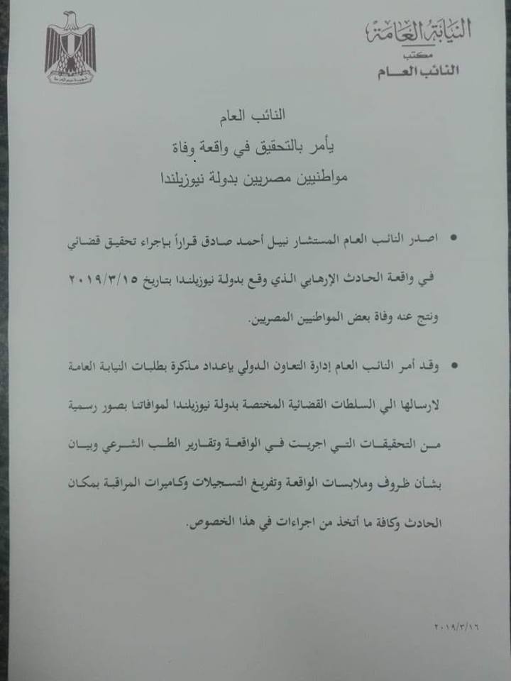 أصدر النائب العام المستشار نبيل احمد صادق قرارا بفتح التحقيقات في واقعة الحادث الإرهابي بدوله نيوزيلندا امس الجمعة عقب اداء الصلاة داخل مسجد بدولة نيوزيلندا