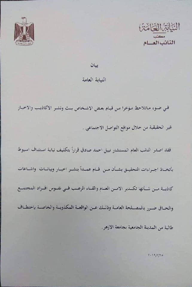 أمر النائب العام المستشار نبيل صادق، بالتحقيق فيما أثير من أخبار وشائعات مكذوبة عن اختطاف طالبة بالمدينة الجامعية لجامعة الأزهر بأسيوط. وكلف النائب العام نيابة استئناف أسيوط باتخاذ إجراءات التحقيق بشأن من نشر عمدًا أخبار وبيانات وشائعات كاذبة من شأنها تكدير الأمن العام وإلقاء الرعب في نفوس أفراد المجتمع وإلحاق ضرر بالمصلحة العامة.