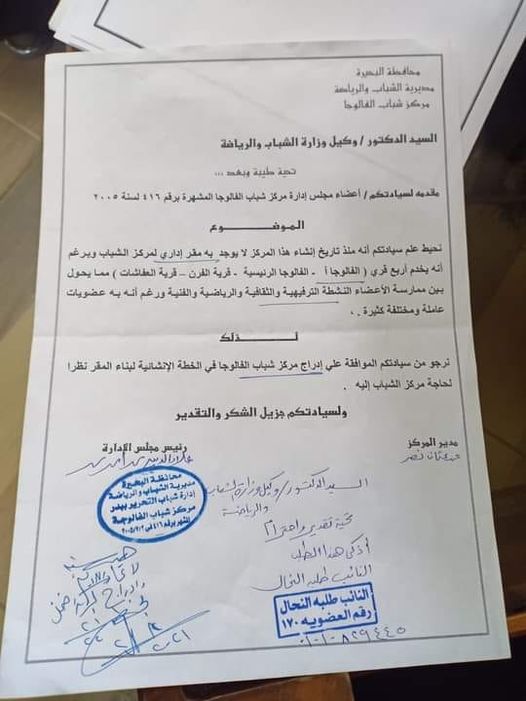 في إطار متابعة النائب طلبة النحال لمتطلبات الأهالي بصفة عامة وخاصة الشباب قام النائب بتوجيهة طلب لوكيل وزارة الشباب والرياضة بالبحيرة لإقامة مبني إداري لمركز شباب الفلوجا والذي وافق سيادتة علي الطلب خدمة للشباب والاهالي