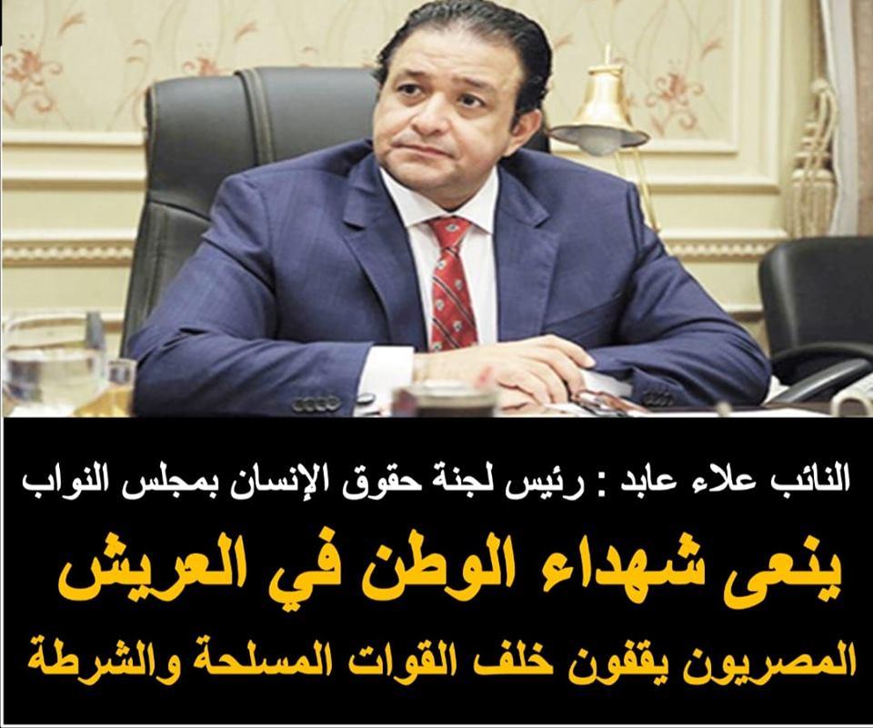 ينعي النائب علاء عابد رئيس لجنة حقوق الإنسان بمجلس النواب ونائب رئيس حزب مستقبل وطن ، شهداء الواجب من أبناء الشرطة الذين ارتقت أرواحهم صباح اليوم فى هجوم إرهابي غادر على أحد الأكمنة الأمنية شمال غرب مدينة العريش بشمال سيناء، عقب أدائهم صلاة الفجر فى أول أيام عيد الفطر المبارك.