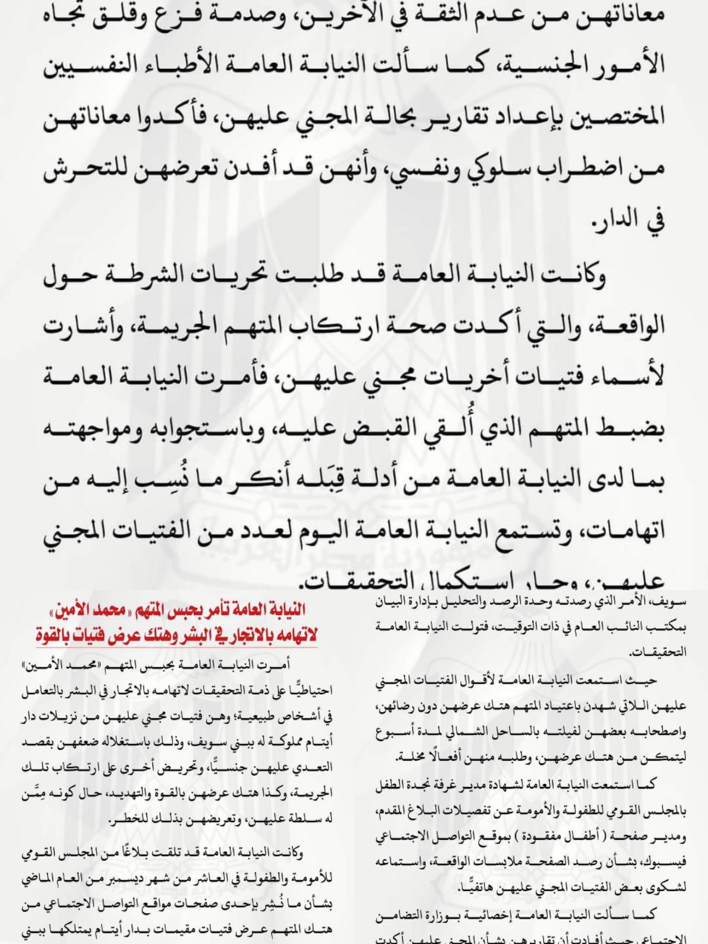 أمرت النيابة العامة بحبس المتهم محمد الأمين احتياطيا على ذمة التحقيقات لاتهامه بالاتجار فى البشر بالتعامل فى أشخاص طبيعية؛ وهن فتيات مجنى عليهن من نزيلات دار أيتام مملوكة له ببنى سويف، وذلك باستغلاله ضعفهن بقصد التعدى عليهن جنسيا، وتحريض أخرى على ارتكاب تلك الجريمة، وكذا هتك عرضهن بالقوة والتهديد، حال كونه ممن له سلطة عليهن، وتعريضهن بذلك للخطر.
