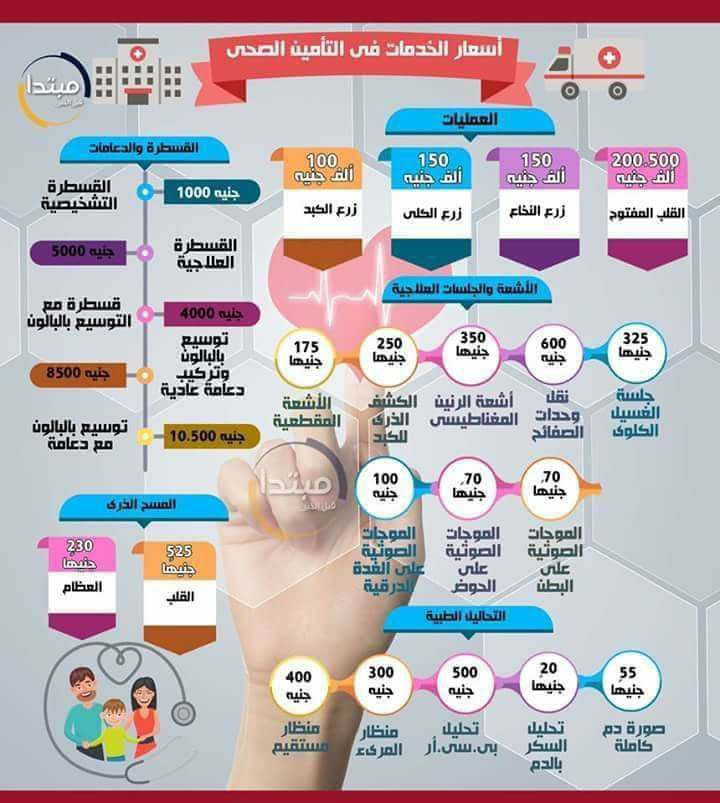 ووفقًا لقائمة الأسعار فتم زيادة تسعيرة عمليات القلب المفتوح من 75 إلى 20500 جنيه بخلاف سعر الصمامات والحلقات والوصلات وتمت زيادة القسطرة التشخيصية من 500 إلى 1000 جنيه والقسطرة العلاجية من 3850 جنيه إلى 5000 جنيه وقسطرة مع التوسيع بالبالون من 3100 إلى 4000 جنيه والتوسيع بالبالون وتركيب دعامة عادية من 6300 إلى 8500 جنيه وتوسيع بالبالون وتركيب 2 دعامة عادية من 8650 إلى 11300 جنيه وتوسيع بالبالون وتركيب 3 دعامة من 11050 إلى 14350 جنيهًا وتوسيع بالبالون مع دعامة دوائية واحدة من 3850 إلى 10500 جنيه وتوسيع بالبالون وتركيب 3 دعامات دوائية من 3850 + 11000 إلى 16000 شامل الدعامات.