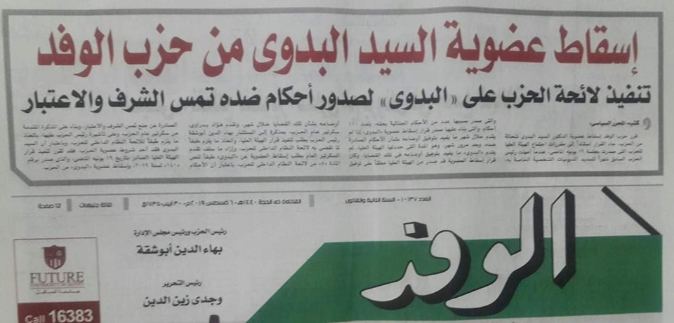 كتب د/كتور سيد العايق الهيئه العليا لحزب الوفد تصدر قرارا بأسقاط عضوية الدكتور/ السيد البدوى رئيس الحزب السابق لصدور احكام جناةيه بحقه .