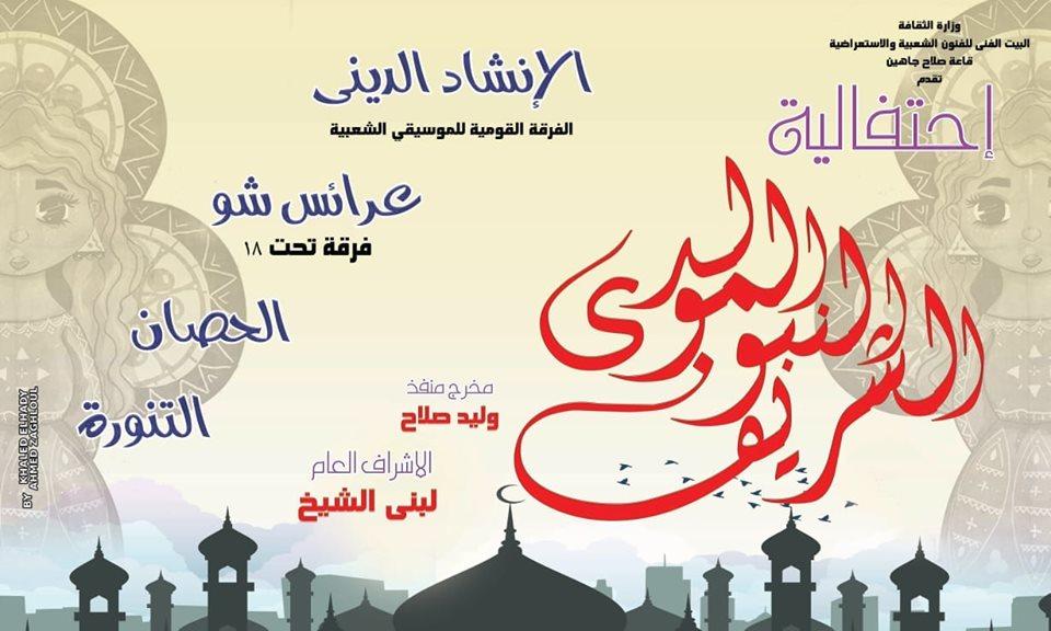 يقيم البيت الفنى للفنون الشعبية والاستعراضية، التابع لقطاع شؤون الإنتاج الثقافى برئاسة المخرج خالد جلال، احتفالية بمناسبة المولد النبوى الشريف، فى الثامنة من مساء غدا الخميس ٧ نوفمبر الجارى على قاعة صلاح جاهين بمسرح البالون .