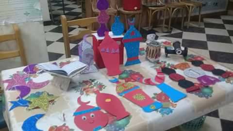 حيث تم إقامة ١-ورشة فنون تشكيلية وعمل أشكال ونماذج من وحى شهر رمضان بأستخدام الفوم الملون والناصيبيان والكانسون والقص واللزق والألوان والورق الملون وبعض الخامات الأخرى.اشراف ا/مروه عبدالراضى