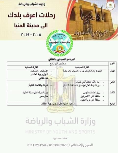 تعلن هيئة مكتب سفراء السلام والشباب بمصر وبالتعاون مع وزارة الشباب والرياضة وتحت رعاية الاستاذ الدكتور / اشرف صبحي - وزير الشباب والرياضة ومن أجل دعم السياحة ومسيرة السلام في مصر عن إنطلاق مشروع ( إعرف بلدك ) بمحافظة المنيا ؛