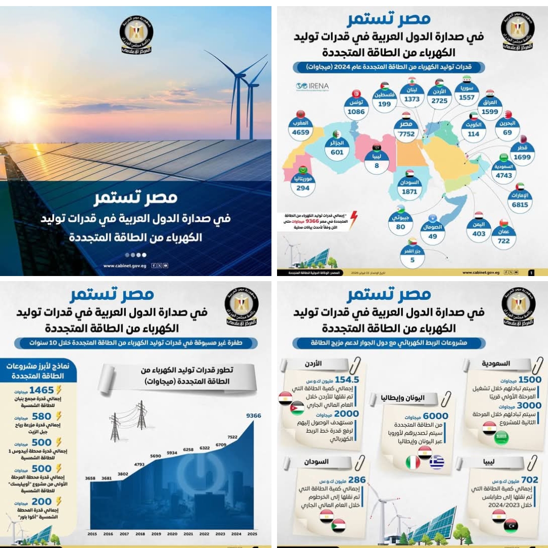 نشر المركز الإعلامي لمجلس الوزراء عددًا من الإنفوجرافات عبر منصاته على مواقع التواصل الاجتماعي، استعرض من خلالها استمرار مصر في صدارة الدول العربية في قدرات توليد الكهرباء من الطاقة المتجددة.