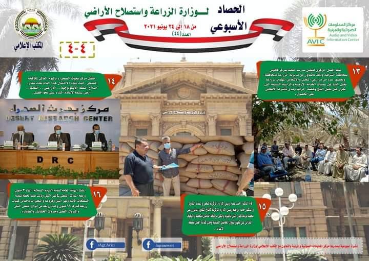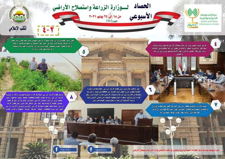 اصدر مركز المعلومات الصوتية والمرئية، التابع لوزارة الزراعة واستصلاح الاراضي، "الانفوجراف الاسبوعي" في نسخته رقم ٤٤، حول الحصاد الاسبوعي لأهم أنشطة الوزارة، خلال الاسبوع الماضي في الفترة من ١٨وحتى ٢٤يونيو الجاري، وذلك بالتعاون مع المكتب الاعلامي للوزارة.