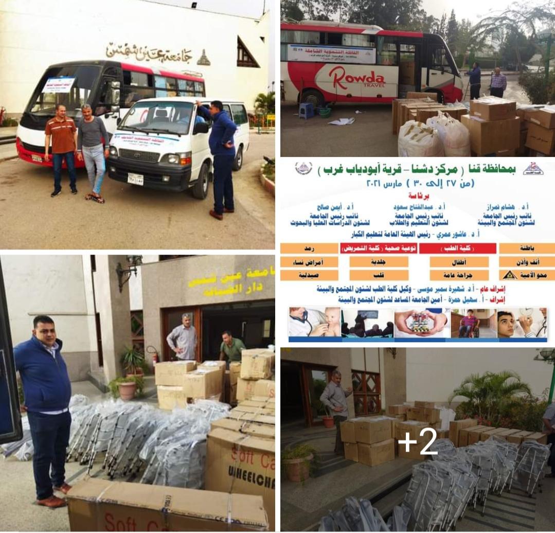 تحت رعاية أ.د. محمود المتيني رئيس جامعة عين شمس و السيد اللواء طيار أ.ح .أشرف غريب الداودي محافظ قنا و أ.د. عبد الفتاح سعود نائب رئيس الجامعة لشئون التعليم و الطلاب و أ.د. أيمن صالح نائب رئيس الجامعة لشئون الدراسات العليا و البحوث و أ.د. هشام تمراز نائب رئيس الجامعة لشئون خدمة المجتمع وتنمية البيئة ، تستعد الجامعة لإطلاق قافلتها التنموية الشاملة لمحافظة قنا ، وذلك تفعيلاً لدور الجامعة في خدمة المجتمع ، حيث ينظم قطاع شؤون خدمة المجتمع وتنمية البيئة برئاسة أ.د. هشام تمراز نائب رئيس الجامعة لشؤون القطاع و إشراف عام أ.د. شهيرة سمير وكيل كلية الطب لشئون خدمة المجتمع وتنمية البيئة و إشراف أ. سهيل حمزة أمين الجامعة المساعد لشئون القطاع قافلة التنمية الشاملة لقرية أبو دياب غرب بمركز دشنا بمحافظة قنا، وذلك خلال الفترة من ٢٧ مارس وحتى ٣٠ من الشهر ذاته لخدمة المواطنين في العديد من المجالات.