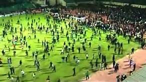 اندفعت جماهير المصرى أرض الملعب وتوجهوا لمدرج الأهلى وقاموا بالإعتداء
