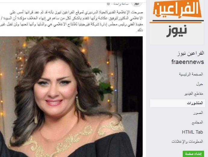 ونشرت الصفحة الرسمية لقناة الفراعين صورة لـ«حياة الدرديري»، وعلقت عليها قائلة "صرحت الإعلامية حياة الدرديري لموقع الفراعين نيوز بأنه قد تم عقد قرانها أمس على الاعلامي الدكتور/ توفيق عكاشة وأنها تتقدم بالشكر لكل من ساهم في إنهاء الخلاف مؤكدة أن السيدة مفيدة الفقي رئيس مجلس إدارة شركة فيرجينيا للإنتاج الإعلامي هي والدتها وأنها تحبها ولن تقبل غير ذلك".