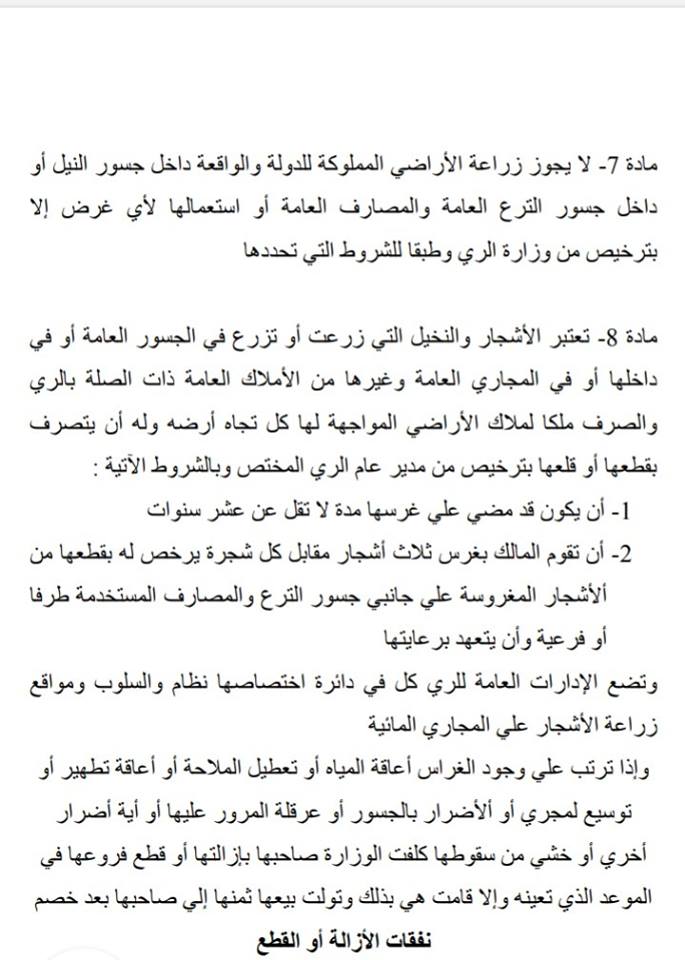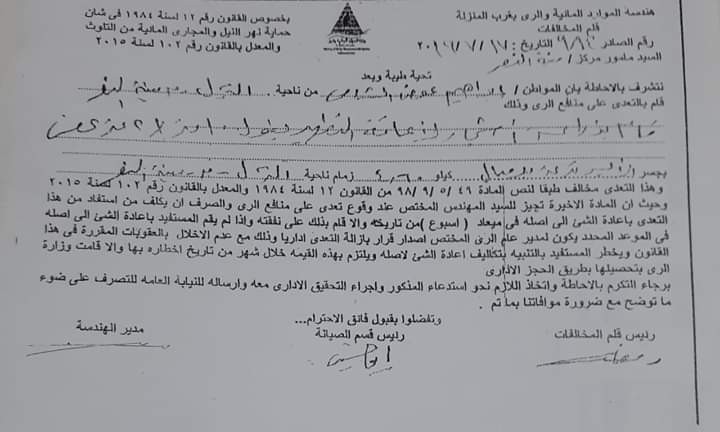 وهذه الماده قد طبقت بكل مافيها في تلك الواقعة ولم يرد نصا يقول تشكيل لجنة ثلاثية وعمل مزاد في هذا الشأن وقامت هندسة ري غرب المنزلة بإرسال خطابات لإزالة المخالفات الواقعة علي الترعة لتطهيرها وتوسيعها .