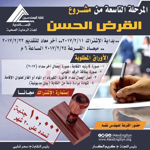 صرح المهندس أحمد الغمري عضو مجلس نقابة المهندسين بالاسكندرية بأنه سيتم فتح الباب للتقدم للمرحلة التاسعة من مشروع القرض الحسن بمبلغ 10.000 وتقسيط علي 20 شهر بدون فوائد بداية الإشتراك من. السبت 11/2/2017 و آخر موعد للتقديم 22/2/2017 ميعاد القرعة 25/2/2017 -بمسرح النقابة الساعة 6 مساءاً