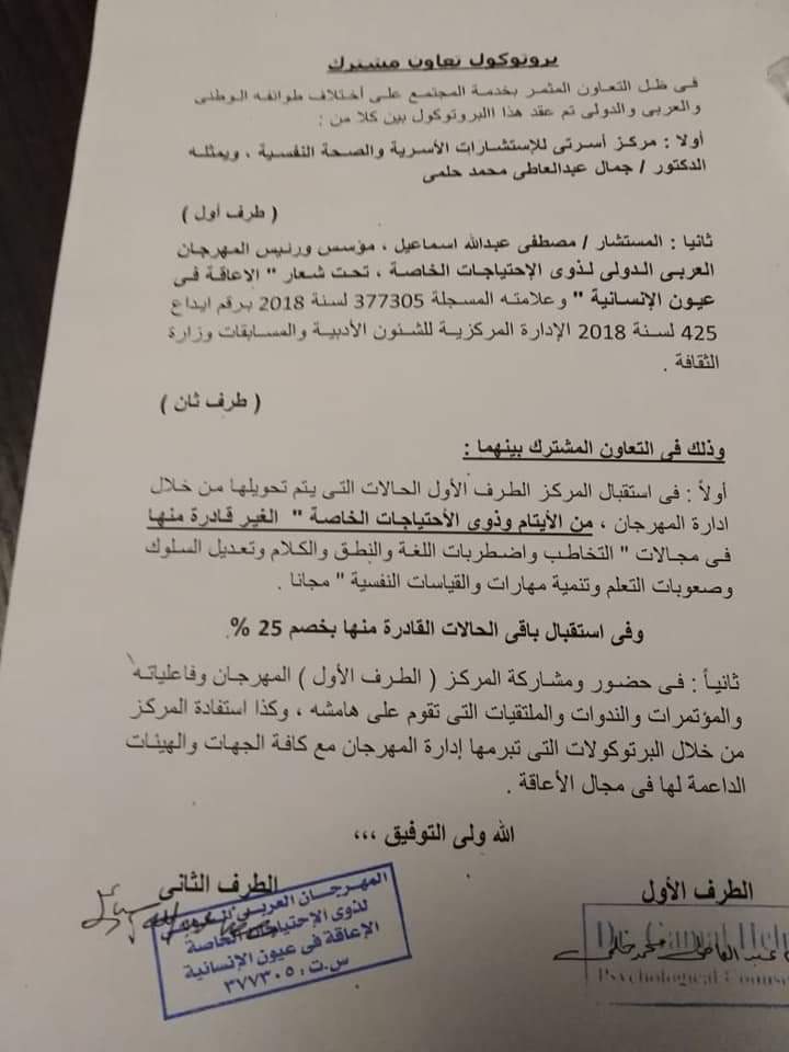 فى ظل التعاون المثمر الذى تقوم به إدارة المهرجان العربى الدولى لذوى الإحتياجات الخاصة بعنوان الإعاقة فى عيون الإنسانية مع الجهات والهيئات والمراكز المتخصصة بالدولة والمهتمة بشؤون الإعاقة الذهنية والحسية والحركية والاقزام .