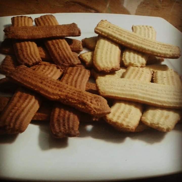 أدفى4 اللبن ثم اضع ملعقة النشادر على اللبن وأقلب ثم أضعه على خليط الزبده والسكر والمدرب شغال ثم انخل الدقيق والكاكاو وذرة الملح والبيكنج بودر وأقلب كويس ثم اضع الخليط فى قمع حلوان أو ماكينة البسكوت وتدهن صاج بالسمن البلدى وأبدأ ارض ثم ادخله الفرن أقل من 180حراره لمدة من 10الى 15دقيقه
