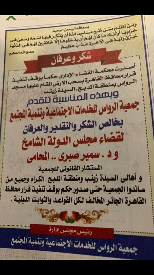 تقدم د سمير صبري المحامي ببلاغ عاجل للنائب العام ونيابة أمن الدولة العليا ضد خالد عبد العال محافظ القاهرة لإصداره قرار بسحب ترخيص الارض النقام عليها مسجد الرواس بمنطقة المدبح بالسيدة زينب وقد أصدرت محكمة القضاء الإداري حكما بوقف تنفيذ قرار محافظ القاهرة بسحب الارض المقام عليها مسجد الرواس بمنطقة المدبح بالسيدة زينب .