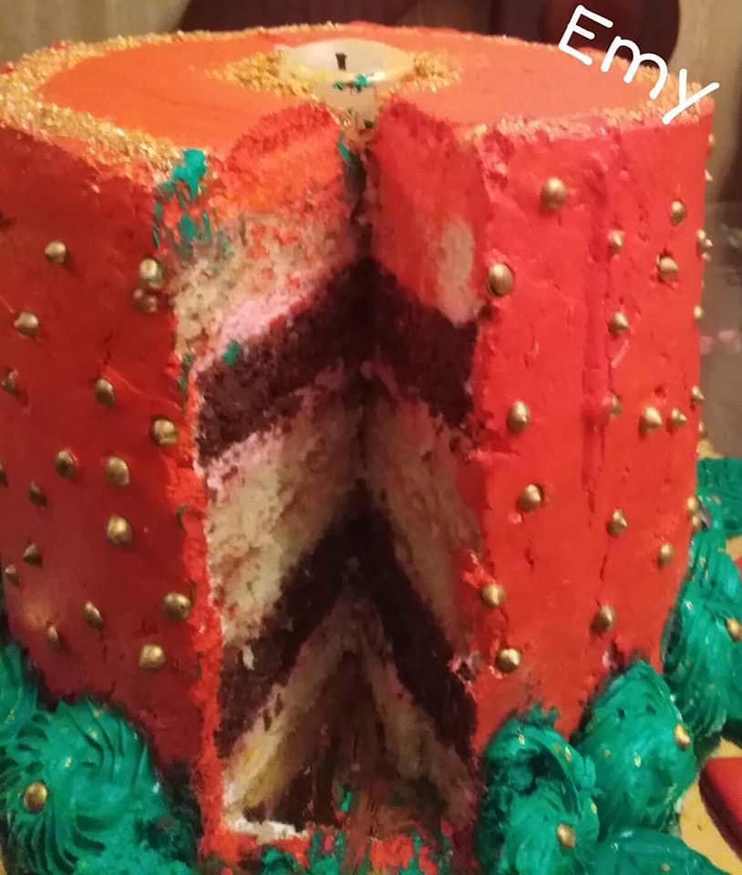 استخدمت مقدارين من مقادير الكيك لعمل ٦طبقات ووضع كريمة الزبدة بين الطبقات وطبقة الكريم الخارجية كريم شانتيه وباستيرى كريم بنسبة ١:٤حيث ان مقدار الباستيرى كريم يكافئ ربع مقدار الكريم شانتيه ونضربة بسكر بودرة وماء مثلج جداااا حتى يتماسك.
